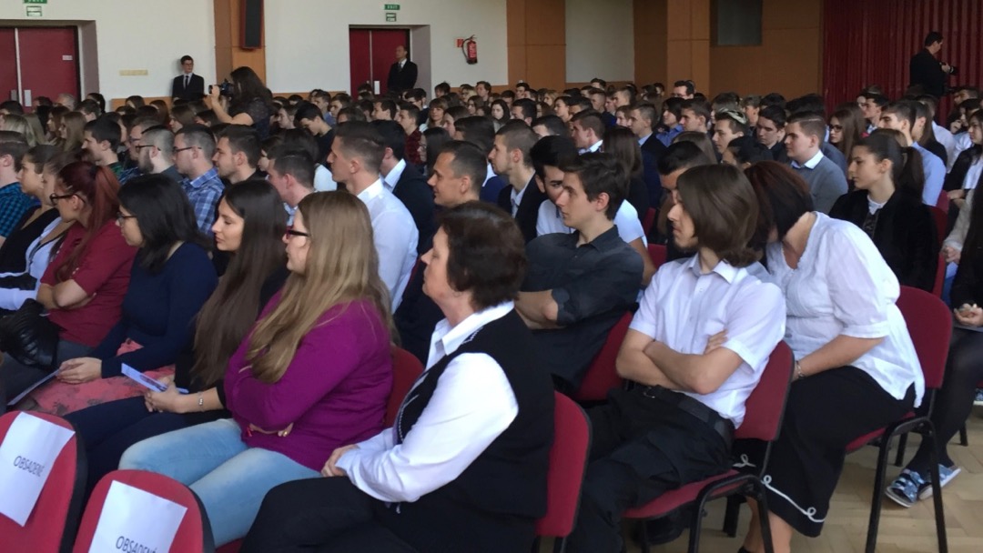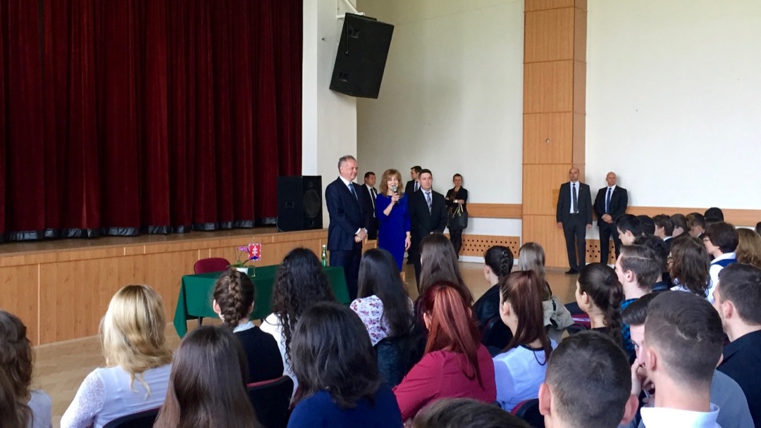 Prezident sa následne presunul do gymnaziálnej auly. Pozdravil sa v oboch jazykoch a potom sa už rozhovoril. Potvrdil svoju povesť dobrého komunikátora či rečníka. Študentom hovoril o veľkom význame správneho výberu ďalšieho štúdia.
