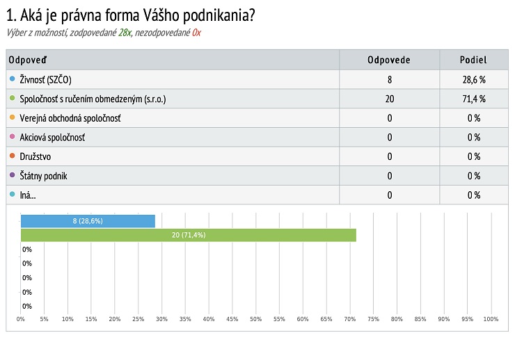 Prvé otázky boli orientované na základné informácie o podnikaní. To znamená, právna forma podnikania, predmet podnikania, geografická pôsobnosť, počet zamestnancov a iné. Z výskumu vyplynulo, že až 71,4 % respondentov má spoločnosť s ručením obmedzeným (s. r. o.) a 28,6 % živnosť (SZČO).