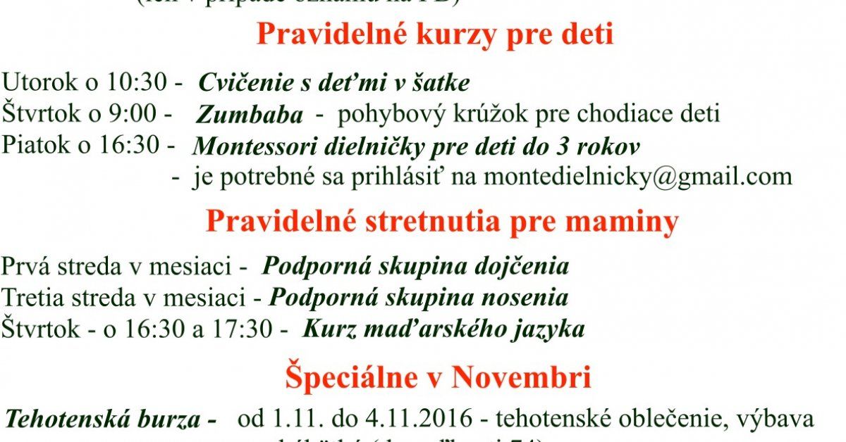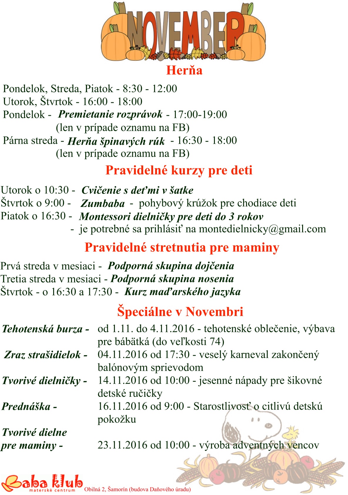Program Baba klubu na november7.11.2016, 12:24OznamPrinášame vám prehľad aktivít na november miestneho Materského centra Baba klub. Nájdete ho na prízemí budovy Daňového úradu na Obilnej ul. č. 2.Zdieľať: