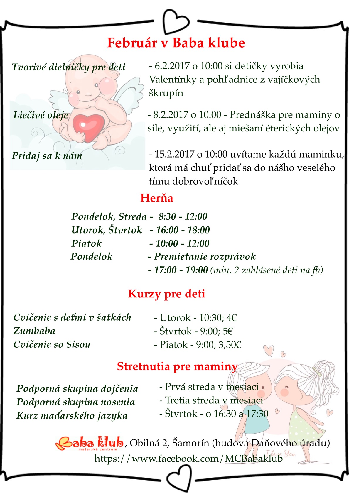 Program materského centra Baba klub na február27.1.2017, 07:51OznamPrinášame Vám program aktivít materského centra Baba klub na mesiac február.Centrum nájdete v budove Daňového úradu na Obilnej ul. 2.Zdieľať: