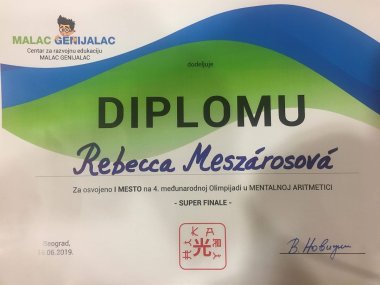 Šamorínčanka Rebecca Meszárosová (13 rokov) sa zúčastnila cez víkend na olympiáde v mentálnej aritmetike v Belehrade,kde sa zúčastnilo vyše 1200 detí z 15 európskych krajín. Účastníci boli zo Srbska, Bosny a Hercegoviny, Čiernej Hory, Chorvátska, Macedónska, Maďarska, Švajčiarska, Ruska, Ukrajiny, Slovenska...