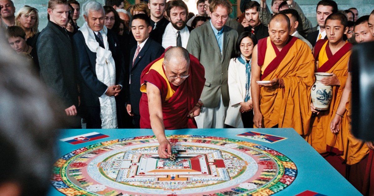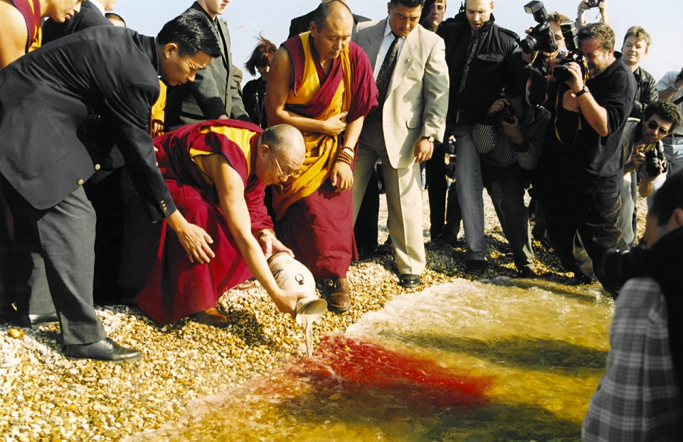 Na hornej snímke dalajláma porcuje hotovú mandalu, ktorú potom rituálne vysype do Dunaja, 2000.
