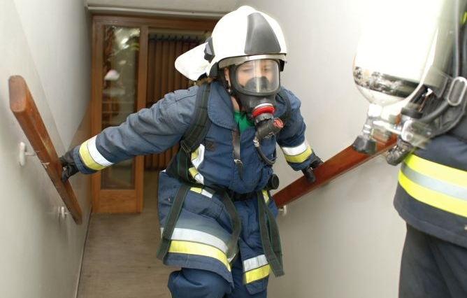 Súťažiaca dvojica je ustrojená v kompletnom zásahovom odeve hasiča (zásahové nohavice, kabát, kukla, prilba, rukavice a zásahová obuv) s dýchacím prístrojom. Dvojica sa od seba nesmie vzdialiť na viac ako jedno schodiskové rameno.