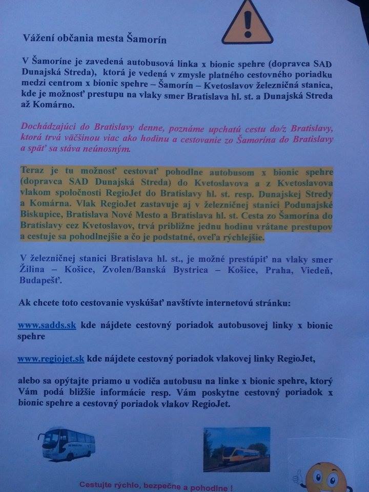 Za existenciu autobusu za zasadzuje aj istý nám neznámy cestujúci, ktorý po meste rozlepil plagáty, v ktorých ho propaguje. V plagátiku upozorňuje Šamorínčanov na existenciu autobusu a píše v ňom, že cesta zo Šamorína do Bratislavy cez Kvetoslavov trvá približne jednu hodinu.