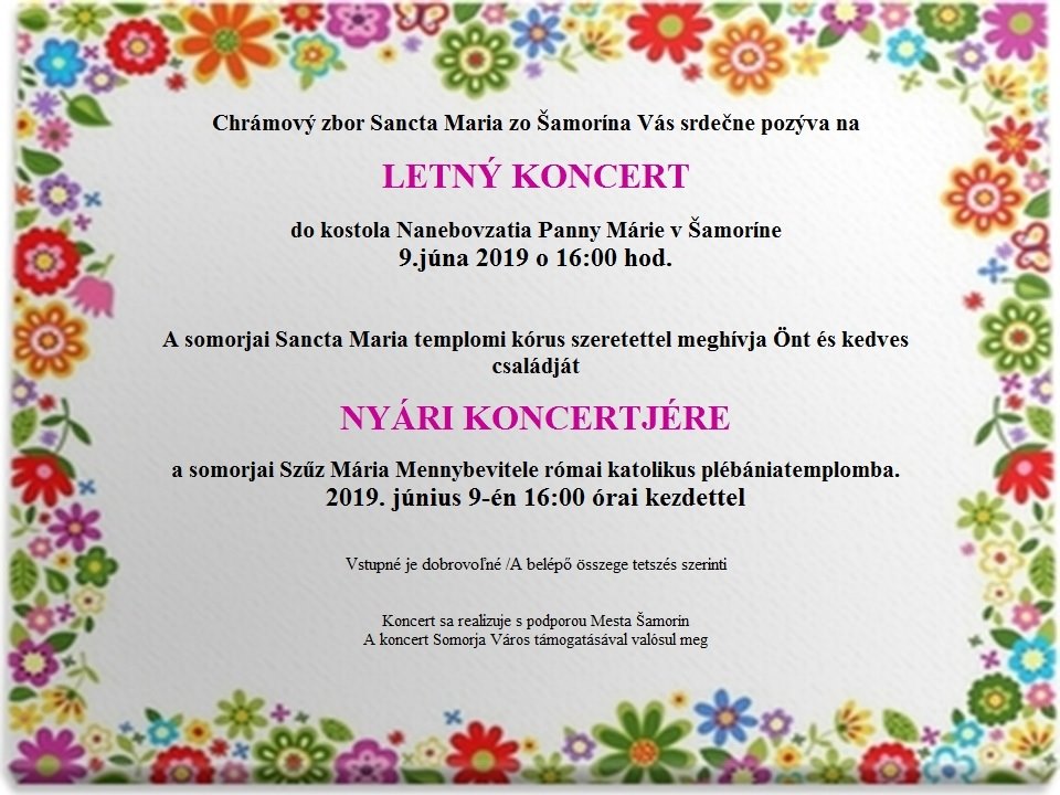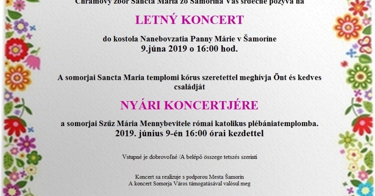 Sancta Maria zaspieva svojmu mestu6.6.2019, 07:12OznamSpevácky zbor Sancta Maria Vás srdečne pozýva na letný koncert už túto nedeľu 9.6.2019.Koncert ze sa realizuje za podpory mesta Šamorín. Vstupné je dobrovoľné.Zdieľať: