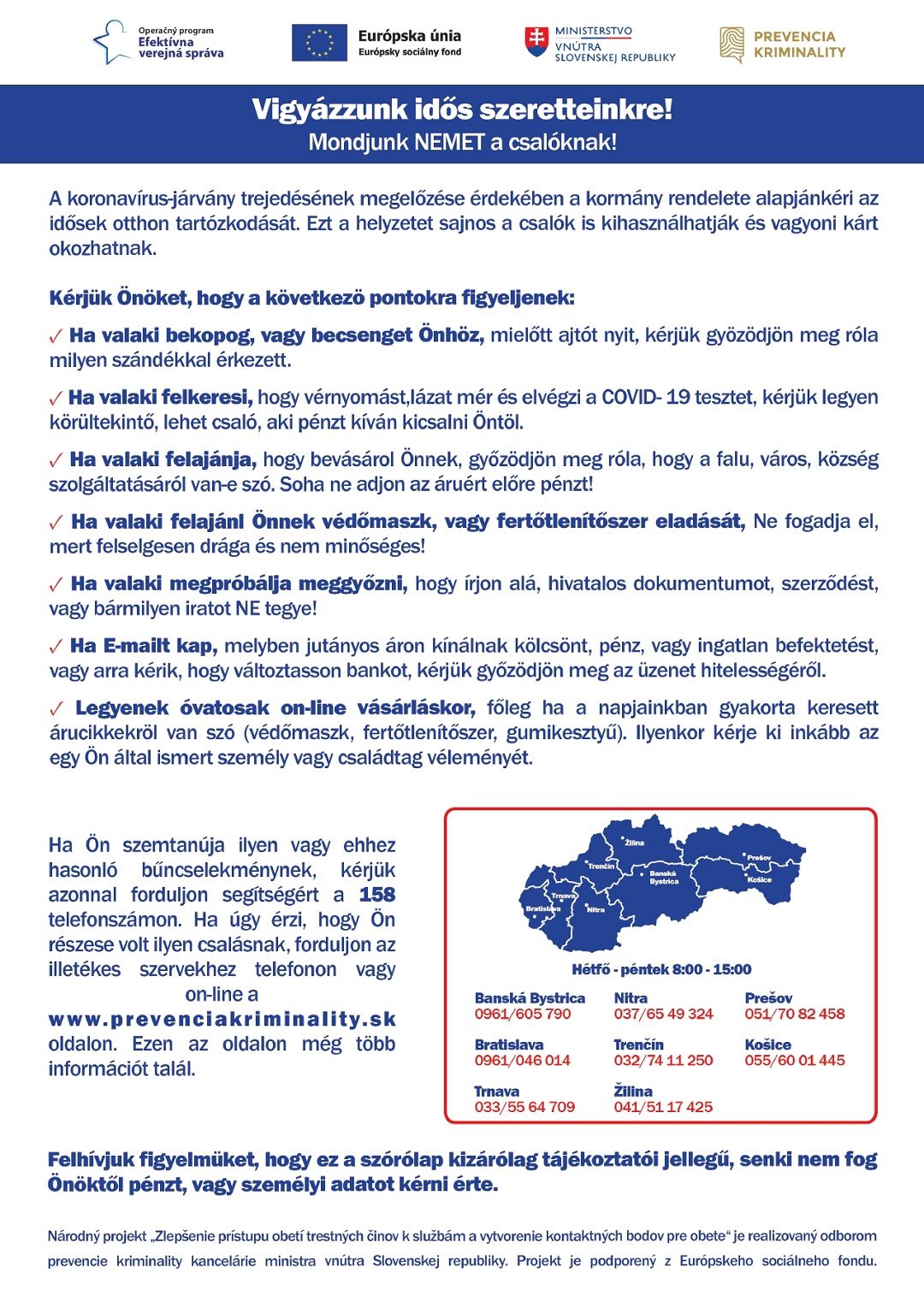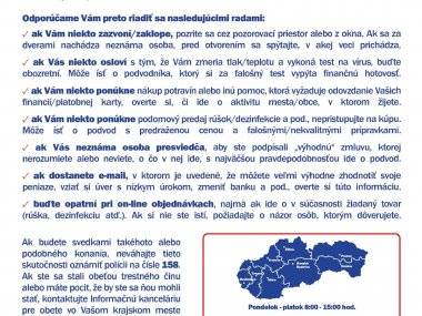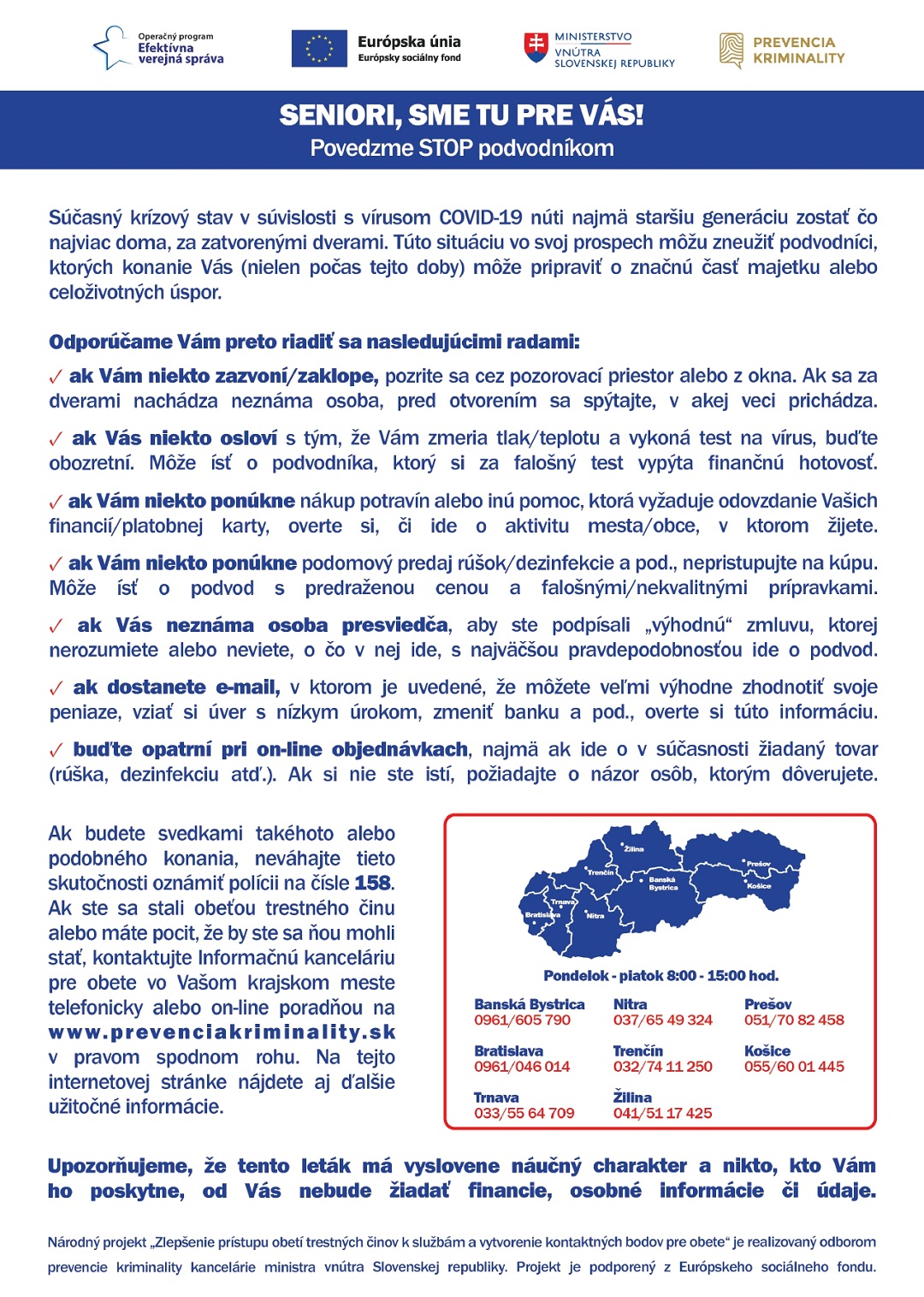 Napriek ťažkej životnej situácii sa nájdu ľudia, ktorí sa snažia svojím nekalým konaním zneužiť dôveru poctivého človeka. Týka sa to predovšetkým cieľovej skupiny SENIORI, avšak obeťou podvodníkov sa môže stať každý z nás. Z dôvodu predchádzania trestnej činnosti v terajšom krízovom režime sme sa rozhodli pripraviť leták obsahujúci krátke rady a odporúčania. Čím väčšiu informovanosť dosiahneme, tým bude riziko nápadu trestnej činnosti menšie.