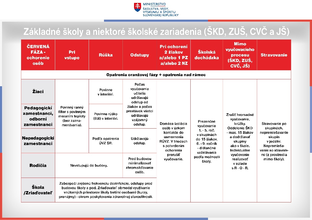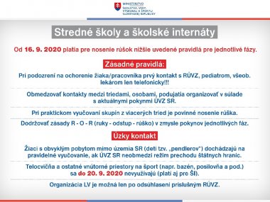 - povinnosť mať vyčlenený priestor na izoláciu pre žiakov, pri ktorých sa v priebehu vyučovania prejavia príznaky ochorenia COVID-19.