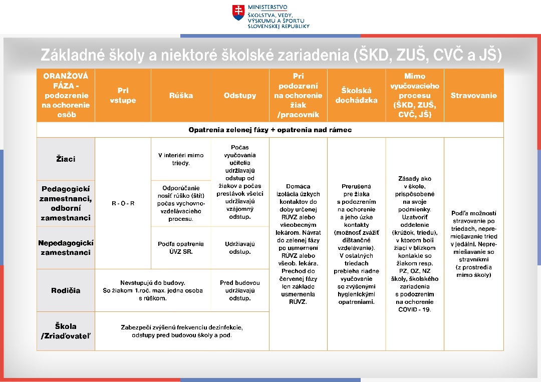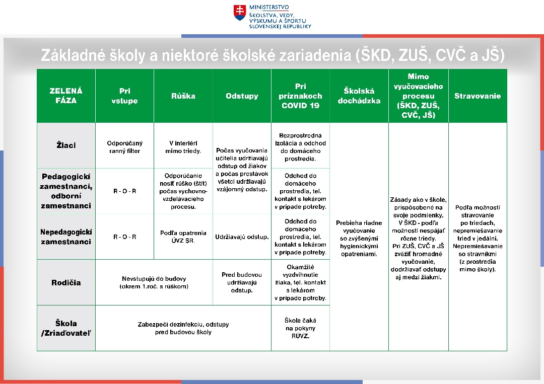 Základné opatrenie je ROR - rúško, odstup, ruky. Nosenie rúška povinne platí počas prvých dvoch týždňov pre žiakov druhého stupňa základných škôl a stredoškolákov. K ďalším navrhovaným, prípadne odporúčaným opatreniam patrí napr. povinnosť školy pri podozrení na nákazu informovať rodiča a ten následne lekára. Ako však uviedla hlavná odborníčka rezortu zdravotníctva pre všeobecnú starostlivosť pre deti a dorast Elena Prokopová, blíži sa jesenné obdobie, pre ktoré je typická chrípka či prechladnutie. K typickým príznakom mierneho ochorenia COVID-19 patrí aj upchatie nosa, výtok z nosa, bolesť hrdla. Symptómy sú zvyčajne mierne a začínajú postupne ako pri iných vírusových ochoreniach. (Tak som zvedavý ako si s takýmto usmernením poradia v jednotlivých školách. Keďže bude na nich zodpovednosť za fungovanie celej školy, tak si viem predstaviť, že pri každom upchatom nose budeme bežať k lekárovi, dať robiť deťom testy na koronavírus a celá škola bude tŕpnuť ako dopadnú testy).