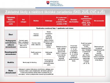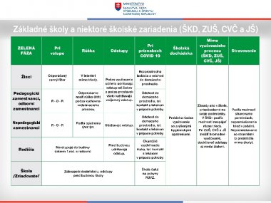 Školy v zelenej fáze budú fungovať v štandardnom režime. Tie, v ktorých sa objaví podozrenie, budú musieť dodržiavať prísnejšie hygienické opatrenia, poznamenal minister školstva. Z manuálu vyplýva, že pri červenej fáze v základných školách sa bude pre žiakov prvého až piateho ročníka realizovať prezenčné vyučovanie v skupinách do 15 žiakov, od šiesteho do deviateho ročníka sa uskutoční dištančné vzdelávanie.