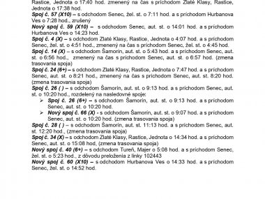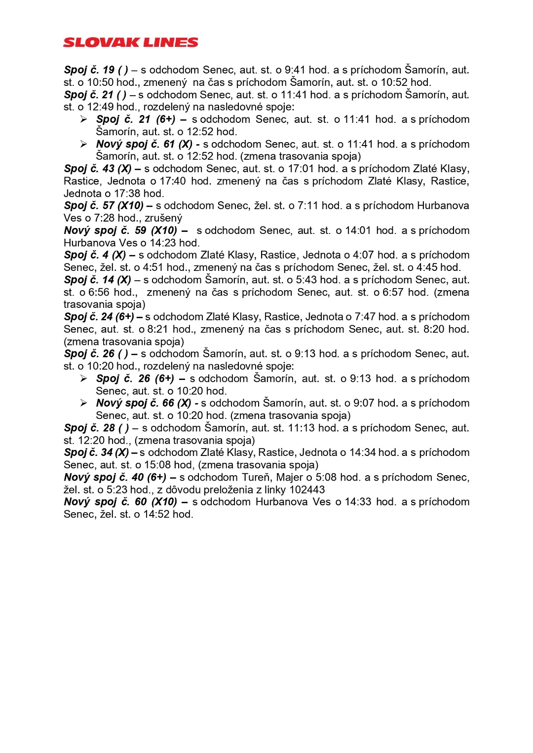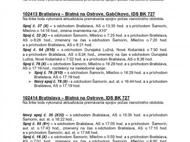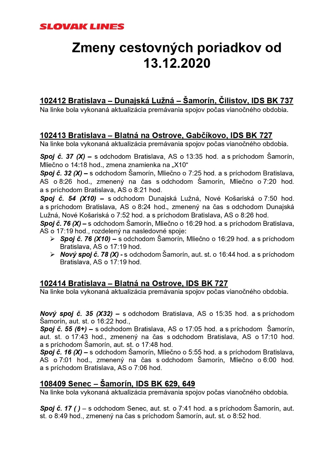 Autobusový prepravca Slovak Lines, a. s. oznamuje cestujúcej verejnosti, že od nedele, 13. decembra 2020 na linkách 102412 Bratislava – Dunajská Lužná – Šamorín, Čilistov (IDS BK 737), 102413 Bratislava – Blatná na Ostrove, Gabčíkovo (IDS BK 727), 102414 Bratislava – Blatná na Ostrove (IDS BK 727) a 108409 Senec – Šamorín (IDS BK 629, 649) dochádza k zmenám cestovných poriadkov. Aktuálne cestovné poriadky prinášame v galérii pod príspevkom.
