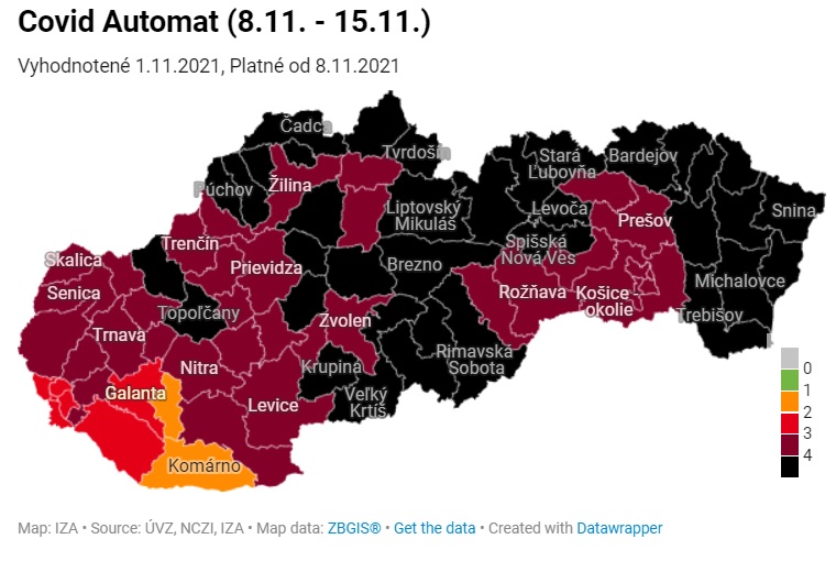Od pondelka 8. novembra už bude 36 okresov v najprísnejšej čiernej farbe covid automatu. Bordových okresov bude 34, červených sedem.