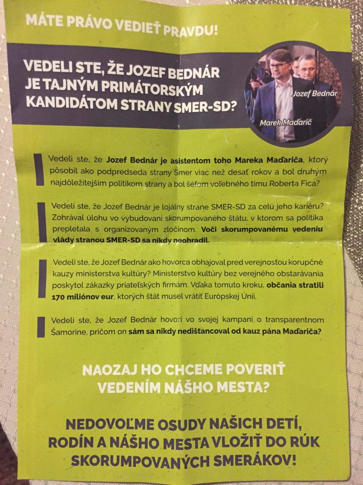 To sa zmenilo pred  pár dňami. Obyvatelia mesta si mohli nájsť v poštových schránkach našli letáky, ktoré útočia na jedného z kandidátov na primátora, konkrétne Jozefa Bednára (nezávislí).