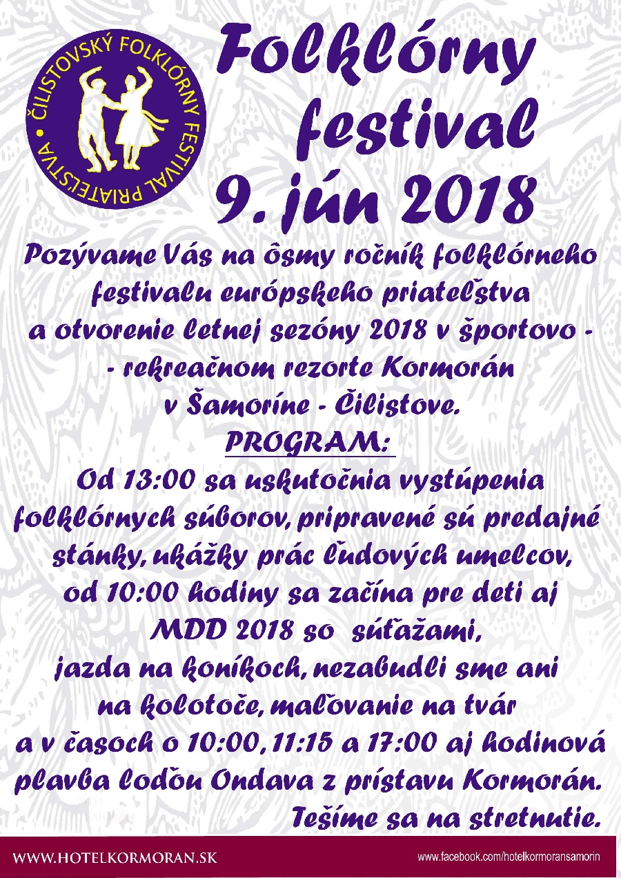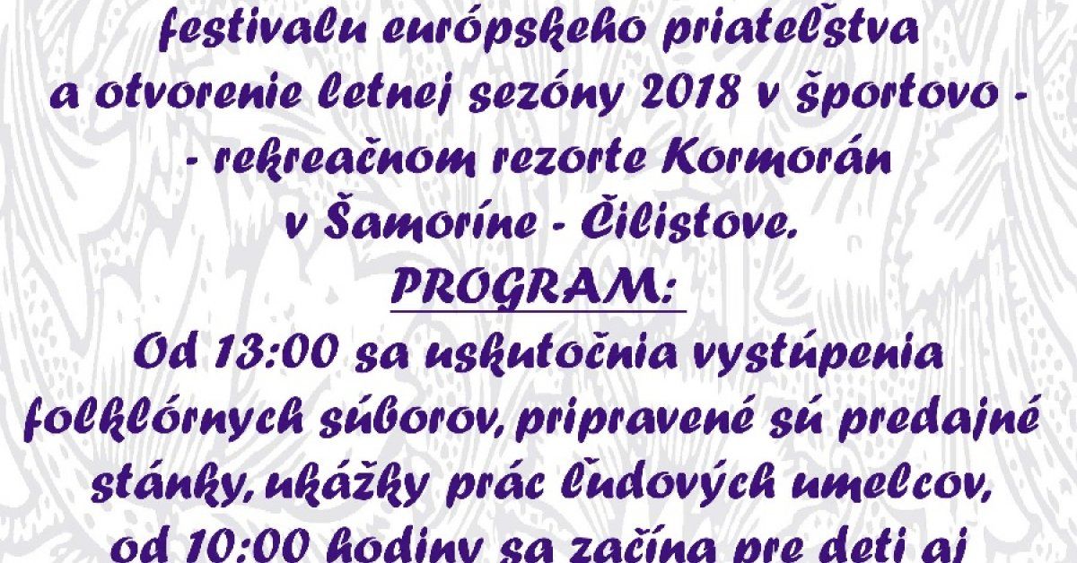 Milí priatelia, už 09. júna sa uskutoční v Areáli Hotela Kormorán každoročný Festival európskeho priateľstva, na ktorý Vás srdečne pozývame. Môžete sa tešiť na šikovných folkloristov z rôznych kútov Slovenska aj zo zahraničia, aby Vám predstavili ich kultúru.