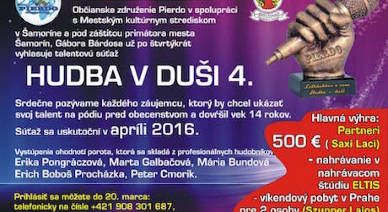 Občianske združenie Piedro v spolupráci s MsKS Šamorín vyhlasuje v poradí už 4. ročník talentovej hudobnej súťaže Hudba v Duši.