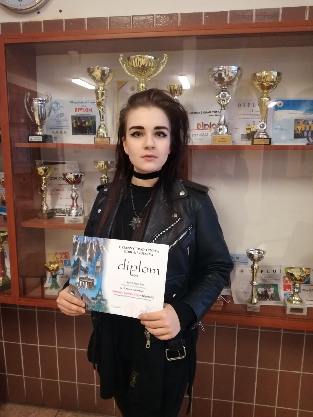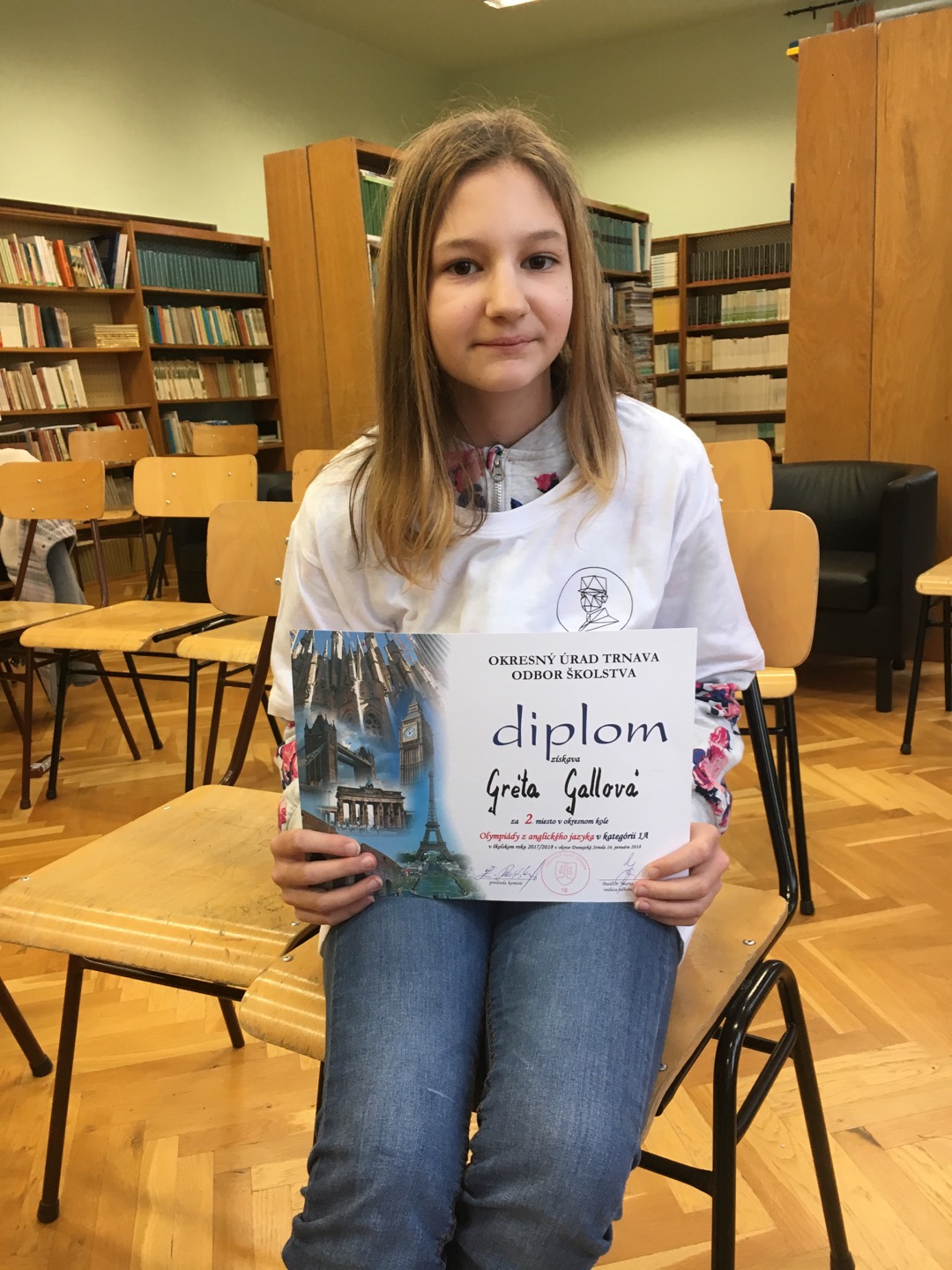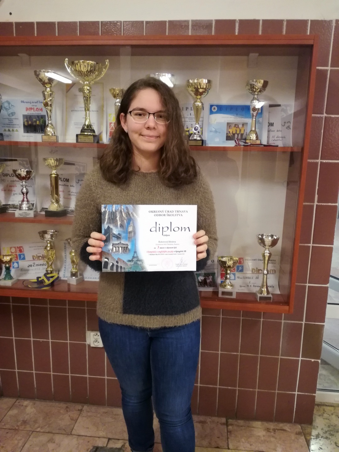 V olympiáde v anglickom jazyku naši žiaci súťažili v piatich kategóriách. Primánka Gréta Gallová sa umiestnila v kategórii 1A na 2. mieste, Oliver Bukor z Kvinty A v kategórii 2A na 4. mieste, septimánka Bibiana Bukorová v kategórii najstarších žiakov 2B získala medailovú pozíciu  a umiestnila sa na 3. mieste. Maturantka Stella Zoé Lukyová súťažila v kategórii 2C2 - „native speaker“ a obsadila, tak ako minulý školský rok, 1. miesto, z ktorého postupuje do krajského kola, ktoré sa bude konať 14. februára 2018 v Trnave.