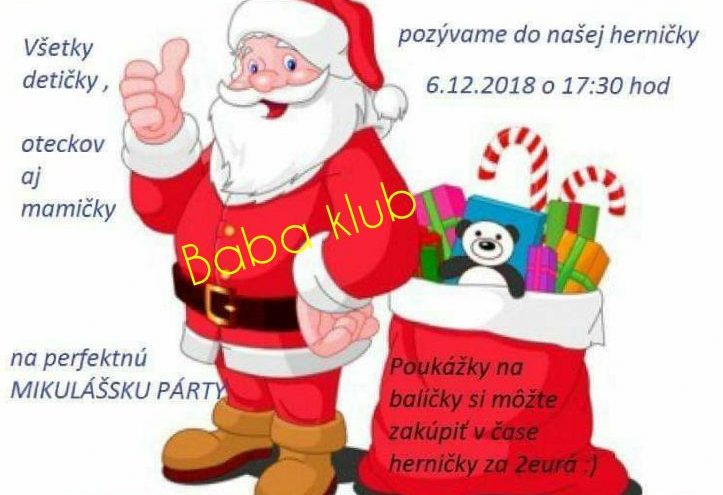 Užite si perfektnú Mikulášskú párty28.11.2018, 10:06OznamMaterské centrum Baba klub pozýva všetky deti, oteckov aj mamičky na Mikulášskú zábavu. Zdieľať:
