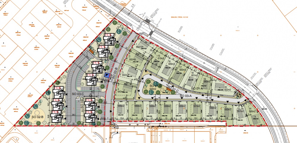 Na ďalšom pozemku s rozlohou vyše 9 600 štvorcových metrov navrhuje firma výstavbu deviatich trojpodlažných bytových domov.