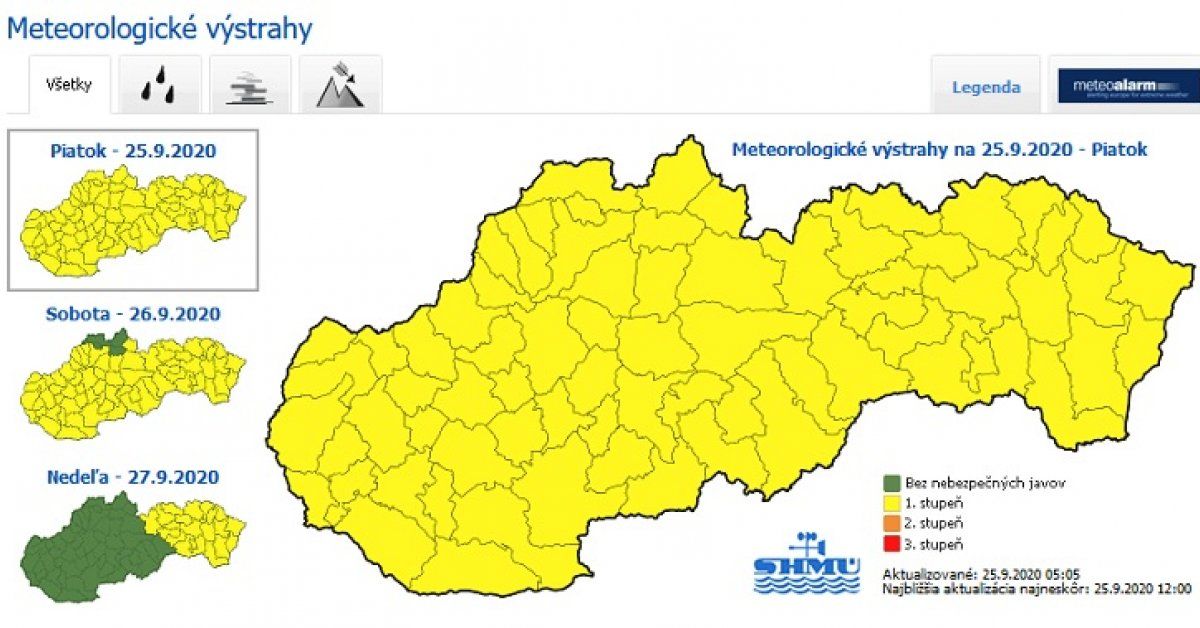 Pre väčšinu územia Slovenska platí na piatok a sobotu výstraha 1. stupňa pred dažďom. Od piatka 12:00 platí táto výstraha aj pre okres Dunajská Streda. Výstraha platí do soboty 12:00.