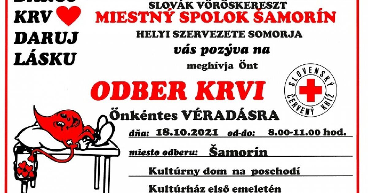 V pondelok môžete darovať krv15.10.2021, 08:30OznamMiestna organizácia Slovenského Červeného kríža vás pozýva na odber krvi. Odber bude tradične v budove Mestského kultúrneho strediska v Šamoríne. Darovanie krvi bude dňa 18.10.2021 od 8:00-10:30.Zdieľať: