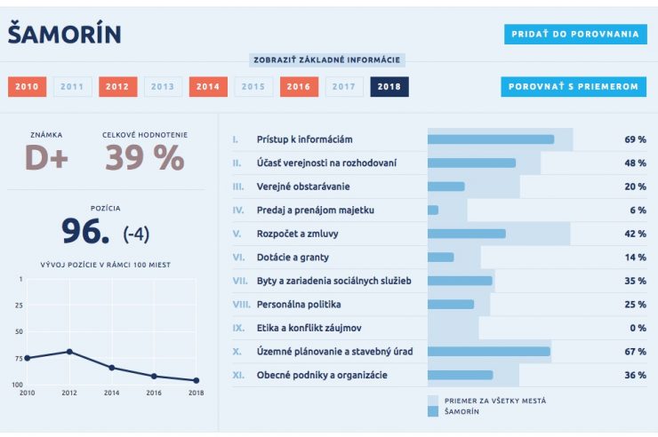 Šamorín sa však nachádza v skupine 14 miest, ktoré si v rebríčku, oproti predchádzajúcemu hodnoteniu, pohoršili. Zo sto miest sme skončili na 96. V roku 2016 skončil Šamorín na 92. mieste, kým v roku 2012 to ešte bolo 69. miesto.