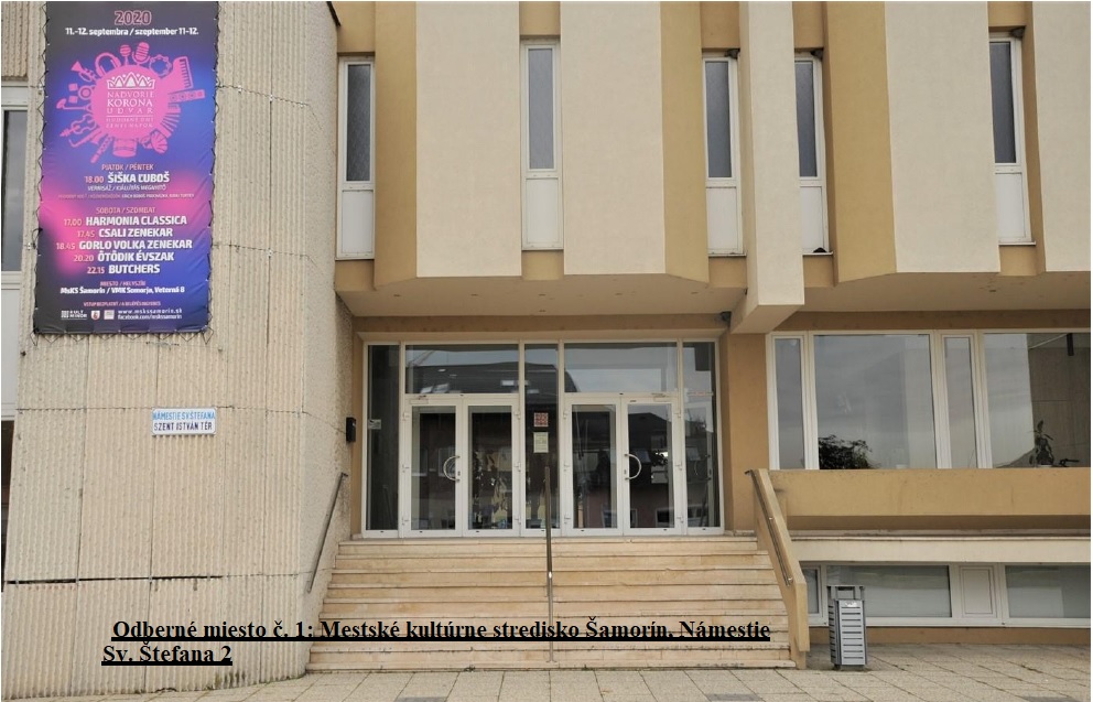 odberné miesto č. 1: Mestské kultúrne stredisko, Námestie Svätého Štefana 2., hlavný vchod