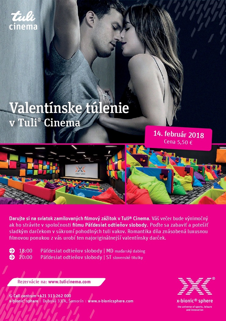 Darujte si na sviatok zamilovaných filmový zážitok v Tuli® Cinema. Váš večer bude výnimočný ak ho strávite v spoločnosti filmu Päťdesiat odtieňov slobody. Poďte sa zabaviť a potešiť sladkým darčekom v súkromí pohodlných tuli vakov.