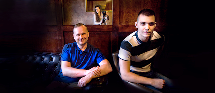 Šamorínčan (Vlado Gábor- vľavo) za svoju novú podobu ďakuje Slávke Bulíkovej (vzadu) a Petrovi Haluskovi (vpravo). Poďakovať chceme ešte Chateau D´Or, coffe&wine bar za poskytnutie priestorov na fotografovanie.