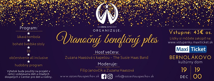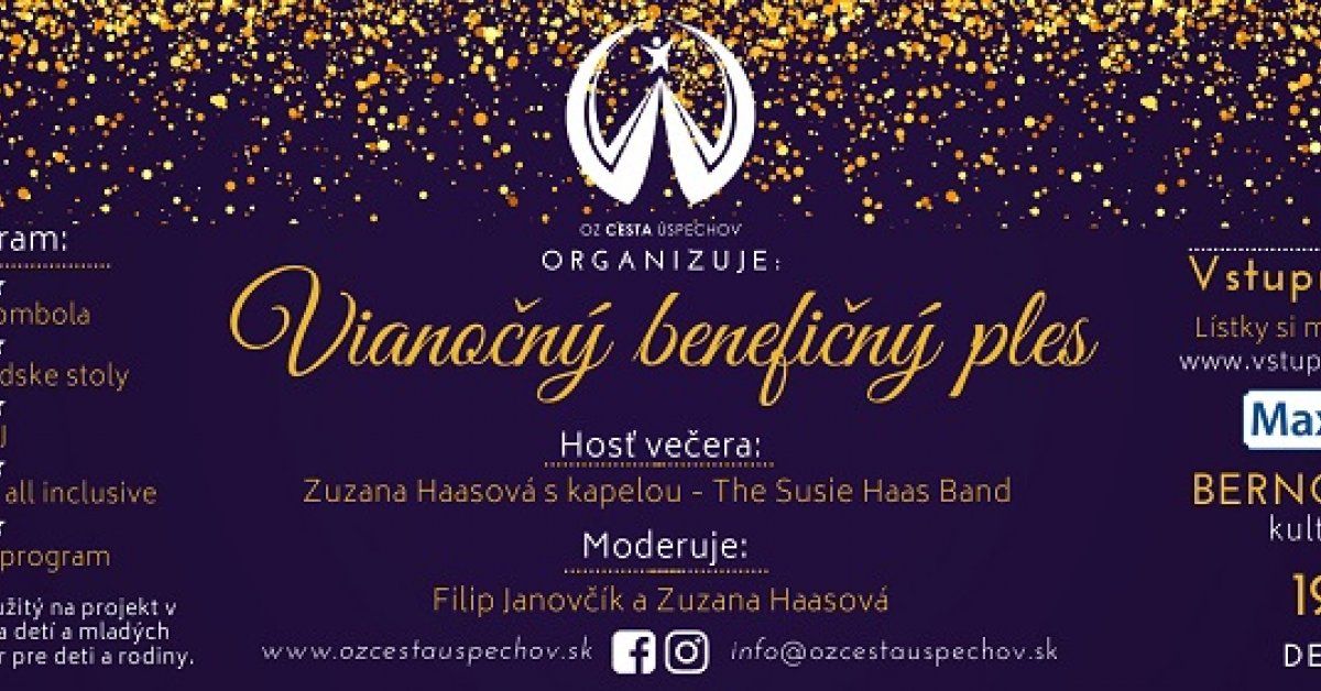 Prvý ročník Benefičného plesu OZ Cesta úspechov sa bude konať v sobotu 19. Decembra 2020 v priestoroch kultúrneho domu Bernolákovo a ponesie sa v znamení pomoci deťom a mladým dospelým z Centier pre deti a rodiny. Svoju náklonnosť k charite a filantropii prejavujú najmä pozvaní hostia a účinkujúci ako sú Zuzana Haasová spolu so skupinou Zuzana Haasova & The Susie Haas Band, IFNE Software, s.r.o. (MaxiTicket) a podnikateľské subjekty.