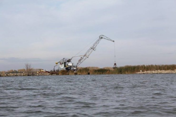 Materiál z takzvaného regulačného bagrovania vždy dotlačia k pristavenému žeriavu remorkéry a žeriav ich následne prekladá na hrádzu lagúny Vtáčieho ostrova.
