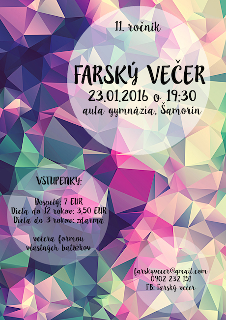 Pozývame Vás na 11. ročník Farského večera, ktorý sa uskutoční v sobotu 23. januára 2016 od 19.30 hod. v aule šamorínskeho Gymnázia M. R. Štefánika.