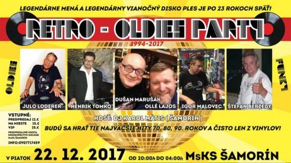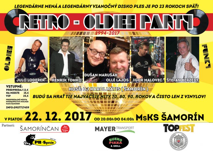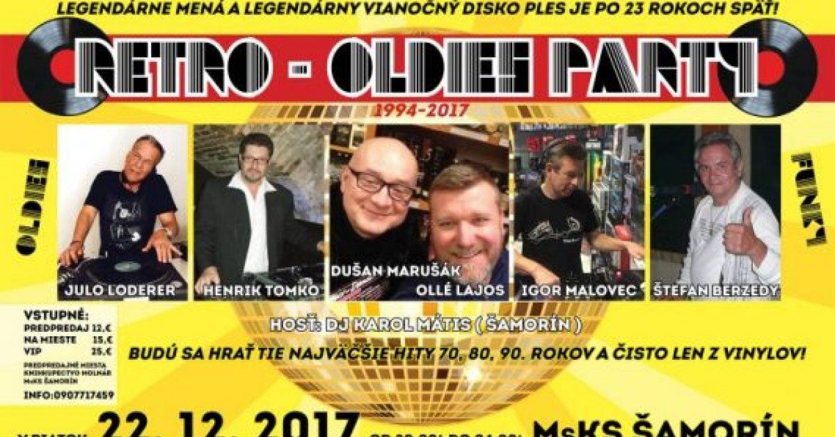 Na Vianoce , v piatok, 22.decembra 2017 sa v šamorínskom MsKS uskutoční najväčší diskoples na Slovensku, akcia roka: Retro – Oldies Party 1994 – 2017! Na túto už nezopakovateľnú show môžte vyhrať až 12 vstupeniek! Stačí len zdieľať, komentovať a lajkovať!;-)Každý piatok žrebujeme!