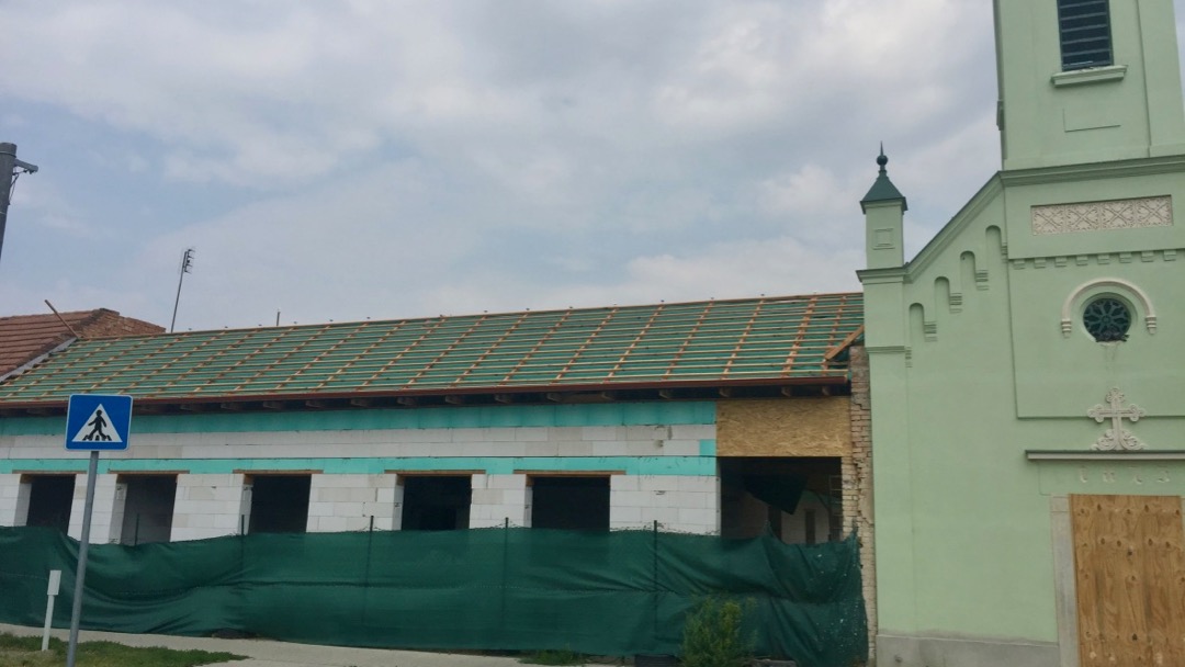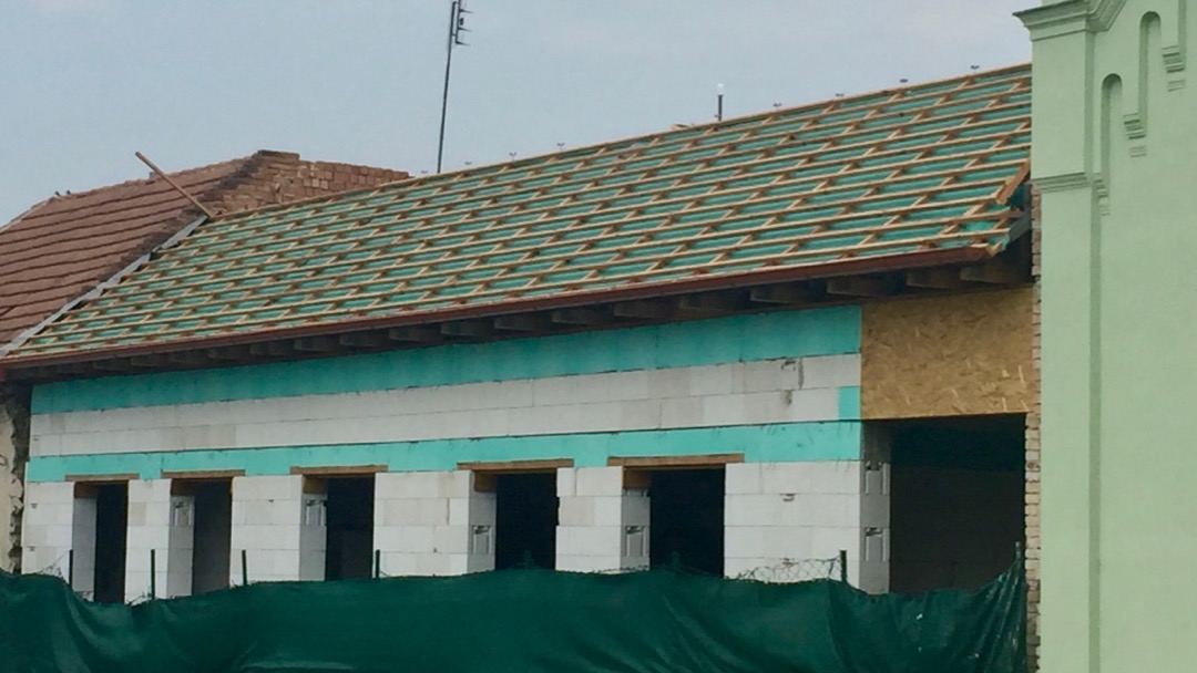 Drevená strešná konštrukcia bola zakrytá izolačnou fóliou, na základe čoho bude možné vykonať ďalšie stavebné práce v interiéri budovy bez ohľadu na poveternostné podmienky.