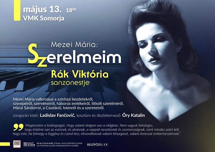 Zajtra (piatok) 13. mája 2022 Mestské kultúrne stredisko pozýva priaznivcov hudby a literatúry na šansónový recitál Viktórie Rákovej, počas ktorého si pripomenie život Márie Mezei, maďarskej divy 30. a 40. rokov.