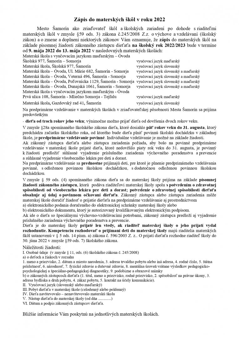 Školský úrad v Šamoríne oznamuje rodičom, že zápis do materských škôl bude prebiehať od 9. mája do 13.mája 2022. Od tohto školského roka je návšteva škôlky povinná pre každé dieťa, ktoré do 31.8.2022 zavŕši 5 rokov.