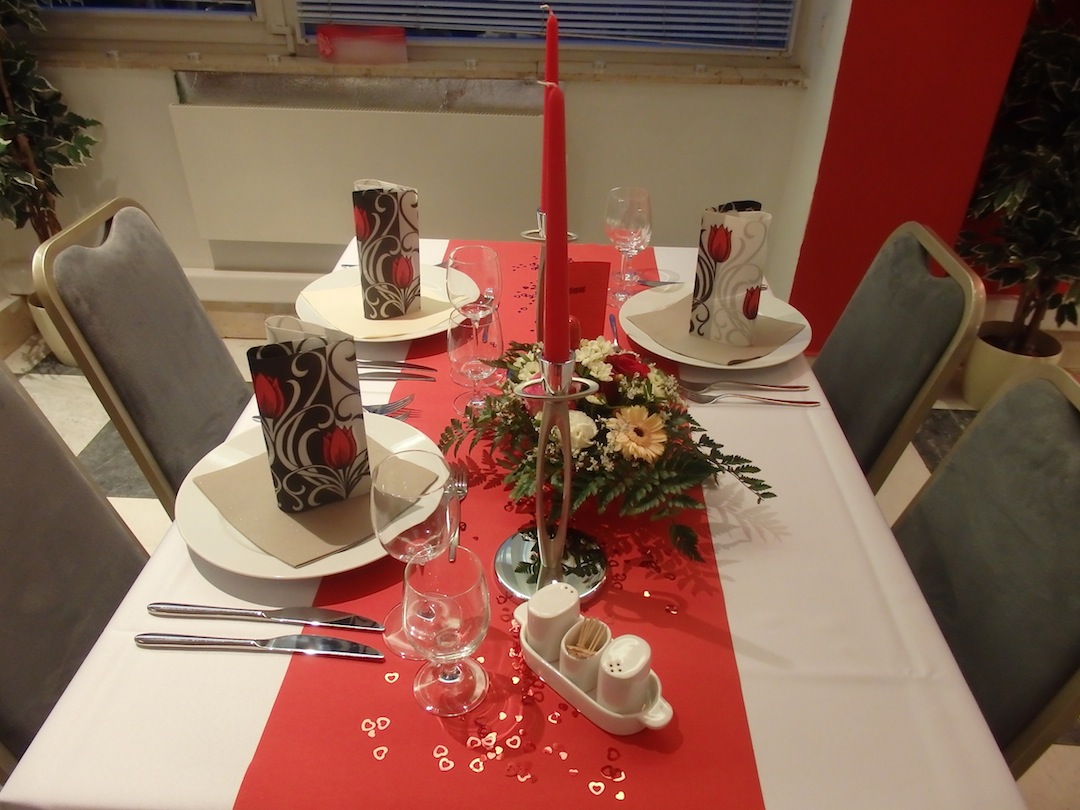 Príjemnú atmosféru plesu umocnilo aj valentínske prestieranie, ktoré bolo tento raz v znamení červeno-šedo-bielej a čiernej farby s tulipánovými servítkami, vkusne doplnené vhodným inventárom.